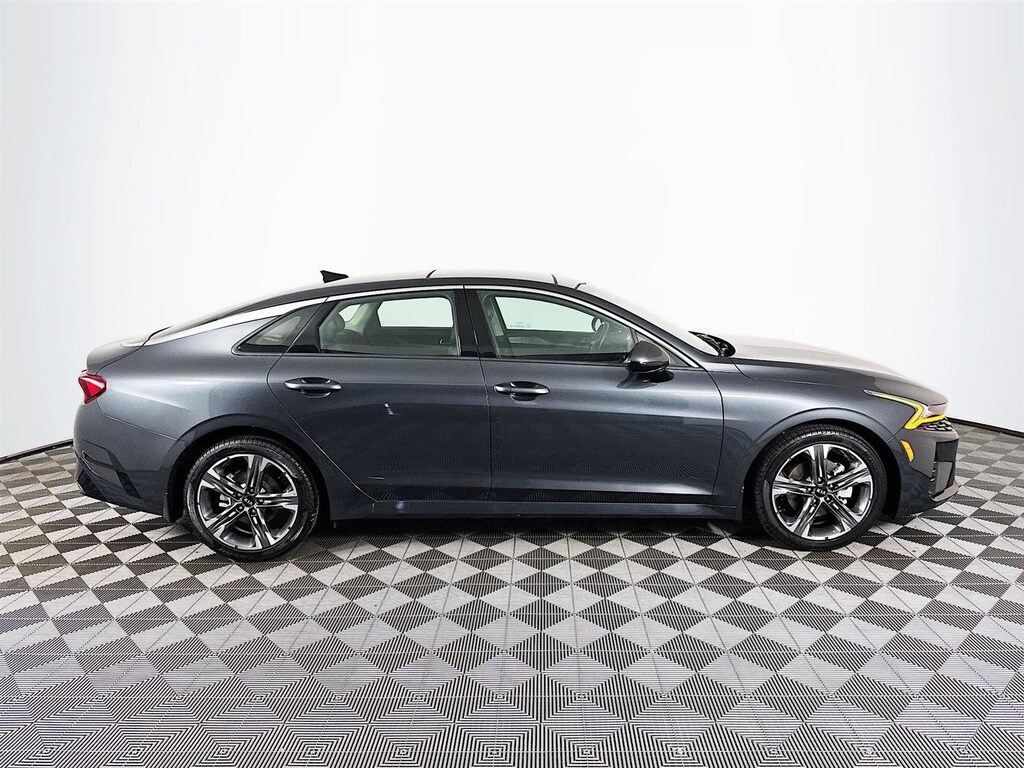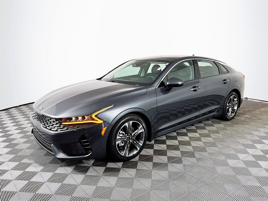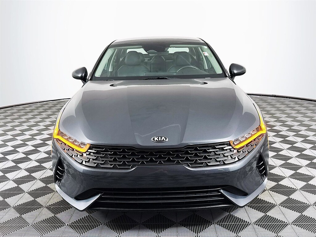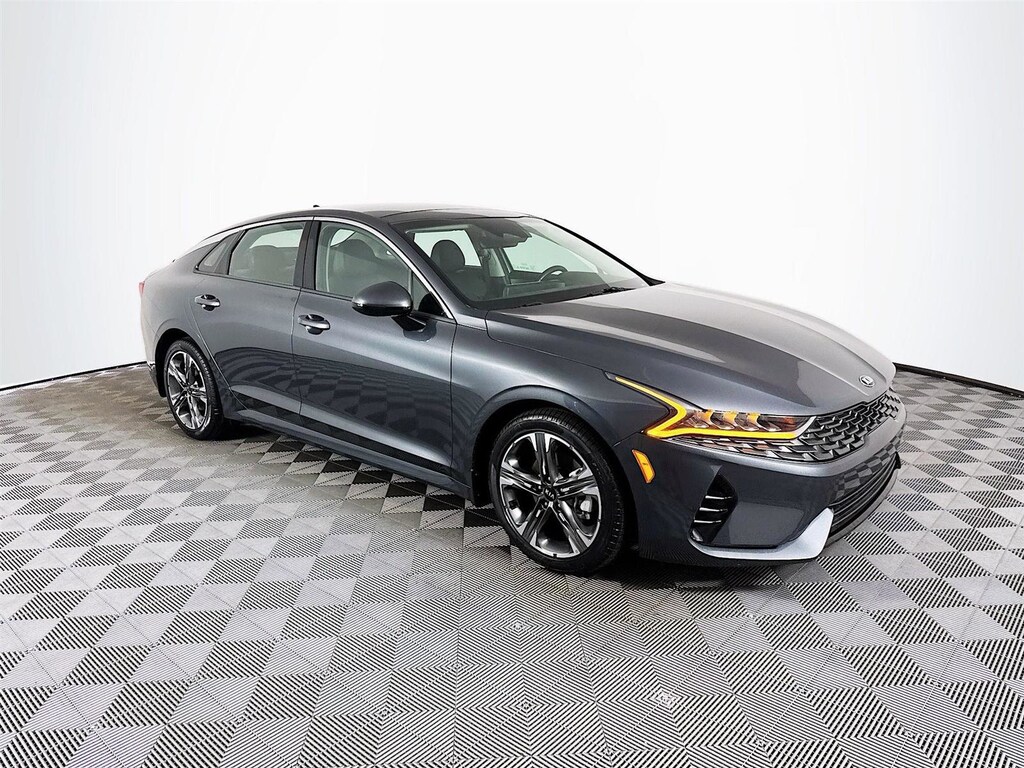This 2021 Kia K5 EX in Gravity Gray features: Kia Certified Pre-Owned Certified, 4-Wheel Disc Brakes, 6 Speakers, ABS brakes, Air Conditioning, Alloy wheels, AM/FM radio: SiriusXM, Apple CarPlay & Android Auto, Auto High-beam Headlights, Automatic temperature control, Brake assist, Bumpers: body-color, Carpeted Floor Mats, Delay-off headlights, Driver door bin, Driver vanity mirror, Dual front impact airbags, Dual front side impact airbags, Electronic Stability Control, Emergency communication system, Four wheel independent suspension, Front anti-roll bar, Front Bucket Seats, Front Center Armrest, Front dual zone A/C, Front reading lights, Fully automatic headlights, Heated & Ventilated Front Bucket Seats, Heated door mirrors, Heated front seats, Illuminated entry, Knee airbag, Leatherette Seat Trim, Low tire pressure warning, Occupant sensing airbag, Outside temperature display, Overhead airbag, Overhead console, Panic alarm, Passenger door bin, Passenger vanity mirror, Power door mirrors, Power driver seat, Power moonroof, Power steering, Power windows, Radio data system, Radio: AM/FM/MP3/SiriusXM Audio System, Rear anti-roll bar, Rear reading lights, Rear seat center armrest, Rear side impact airbag, Rear window defroster, Remote keyless entry, Security system, Smart Key w/ Push Button and Remote Start, Speed control, Speed-sensing steering, Split folding rear seat, Steering wheel mounted audio controls, Tachometer, Telescoping steering wheel, Tilt steering wheel, Traction control, Trip computer, Variably intermittent wipers, Ventilated front seats, Wheels: 7.5J x 18" Gray Machined Finish Alloy. Certified. 27/37 City/Highway MPG