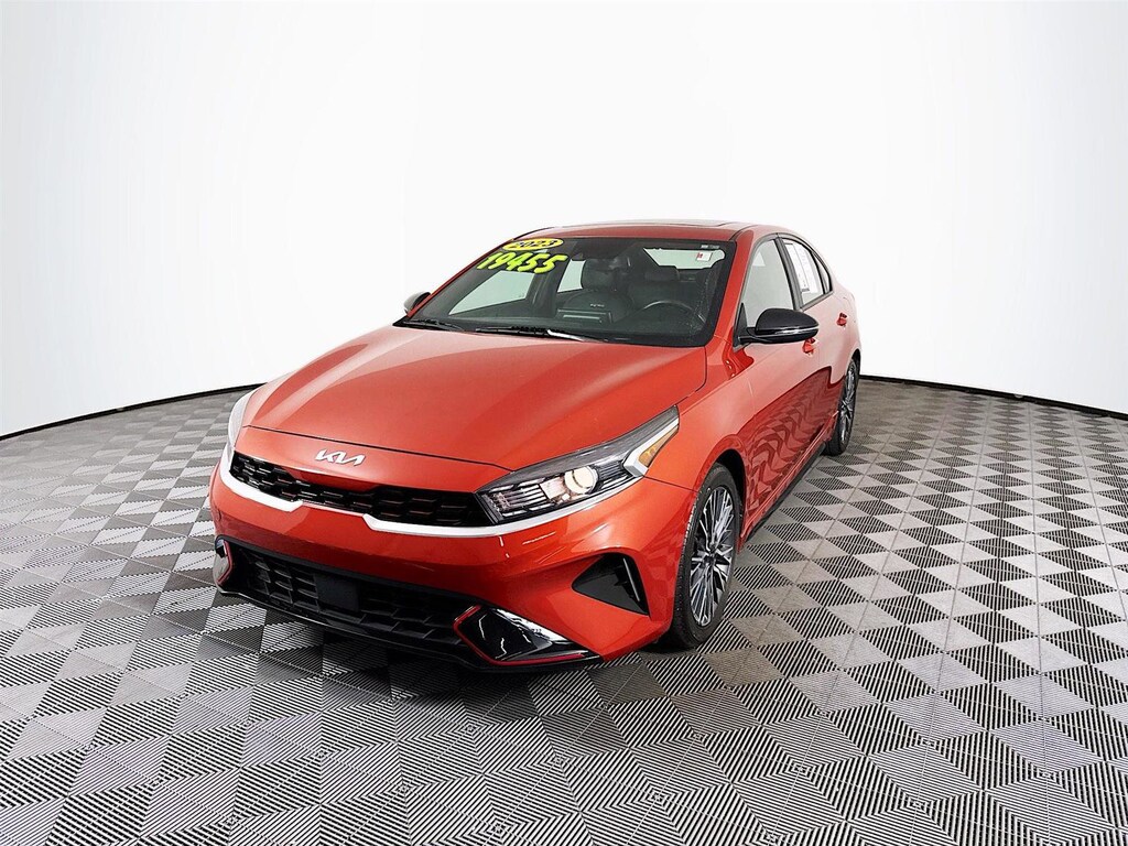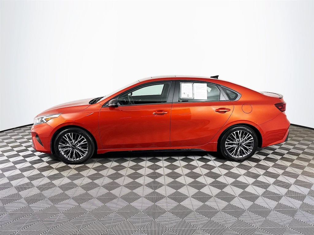 This 2023 Kia Forte GT-Line in Fire Orange features: Kia Certified Pre-Owned Certified, 10-Way Power Driver's Seat, 17" x 7.0J Alloy Wheels, 4-Wheel Disc Brakes, 6 Speakers, ABS brakes, Air Conditioning, Alloy wheels, AM/FM radio: SiriusXM, Apple CarPlay & Android Auto, Auto High-beam Headlights, Automatic temperature control, Brake assist, Bumpers: body-color, Carpet Floor Mats, Cloth & SynTex Seat Trim, Delay-off headlights, Driver door bin, Driver vanity mirror, Dual front impact airbags, Dual front side impact airbags, Electronic Parking Brake (EPB), Electronic Stability Control, Emergency communication system, Exterior Parking Camera Rear, Forward Collision Avoidance-Assist - Cyclist, Front anti-roll bar, Front Bucket Seats, Front Center Armrest, Front dual zone A/C, Front fog lights, Front reading lights, Front wheel independent suspension, Fully automatic headlights, GT-Line Premium Package, GT-Line Sport Premium Package, Heated & Ventilated Front Seats, Heated door mirrors, Illuminated entry, Leather Shift Knob, Leather steering wheel, LED Interior Lighting, Low tire pressure warning, Navigation System, Navigation-Based Smart Cruise Control (NSCC), Occupant sensing airbag, Outside temperature display, Overhead airbag, Overhead console, Panic alarm, Passenger door bin, Passenger vanity mirror, Power door mirrors, Power steering, Power Sunroof, Power windows, Radio data system, Radio: 10.25" Display Audio, Radio: harman kardon Premium Audio, Rear AC Vent, Rear seat center armrest, Rear USB Charger, Rear window defroster, Remote keyless entry, Security system, Smart Cruise Control w/Stop & Go, Speed control, Split folding rear seat, Spoiler, Sport steering wheel, Steering wheel mounted audio controls, SynTex Seat Trim, Tachometer, Telescoping steering wheel, Tilt steering wheel, Traction control, Trip computer, Turn signal indicator mirrors, Variably intermittent wipers, Wireless Charging. Certified. Clean CARFAX. CARFAX One-Owner. 28/39 City/Highway MPG