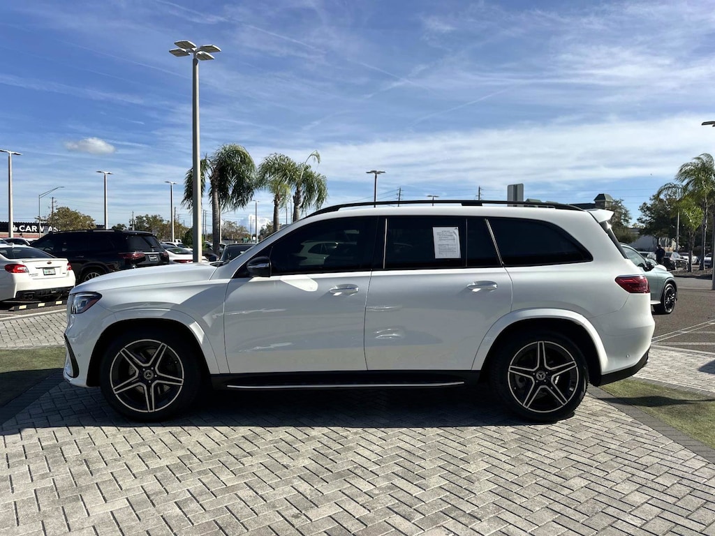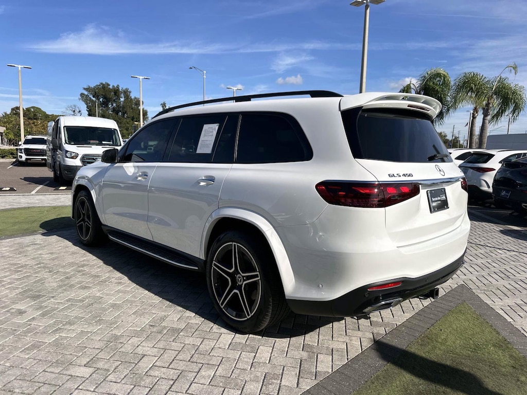 2025 Mercedes-Benz GLS 450 4MATIC® Mercedes-Benz Certified, 13 Speakers, 3rd row seats: split-bench, 4-Wheel Disc Brakes, 7-Seat Configuration, ABS brakes, Adaptive suspension, Air Conditioning, Alloy wheels, AM/FM radio: SiriusXM, Apple CarPlay®/Android Auto®, Auto High-beam Headlights, Auto tilt-away steering wheel, Auto-dimming door mirrors, Auto-dimming Rear-View mirror, Auto-leveling suspension, Automatic temperature control, Brake assist, Bumpers: body-color, Child-Seat-Sensing Airbag, Compass, Delay-off headlights, Driver door bin, Driver vanity mirror, Dual front impact airbags, Dual front side impact airbags, Electronic Stability Control, Emergency communication system: eCall Emergency System, Exterior Parking Camera Rear, Four wheel independent suspension, Front anti-roll bar, Front Bucket Seats, Front Center Armrest w/Storage, Front dual zone A/C, Front reading lights, Fully automatic headlights, Garage door transmitter: HomeLink, Head restraints memory, Heated and Ventilated Power Front Seats with Memory, Heated door mirrors, Heated front seats, Illuminated entry, Knee airbag, Leather steering wheel, Low tire pressure warning, MB-Tex Upholstery, Memory seat, Navigation system: MB Navigation, Occupant sensing airbag, Outside temperature display, Overhead airbag, Overhead console, Panic alarm, Passenger door bin, Passenger vanity mirror, Power adjustable front head restraints, Power door mirrors, Power driver seat, Power Liftgate, Power moonroof: Panorama, Power passenger seat, Power steering, Power windows, Premium audio system: MBUX, Radio: Burmester® Surround Sound System, Rain sensing wipers, Rear air conditioning, Rear anti-roll bar, Rear dual zone A/C, Rear fog lights, Rear reading lights, Rear seat center armrest, Rear window defroster, Rear window wiper, Reclining 3rd row seat, Remote keyless entry, Security system, Speed control, Speed-sensing steering, Speed-Sensitive Wipers, Split folding rear seat, Spoiler, Steering wheel memory, Steering wheel mounted audio controls, Tachometer, Telescoping steering wheel, Tilt steering wheel, Traction control, Trip computer, Turn signal indicator mirrors, Variably intermittent wipers, Ventilated front seats, Weather band radio, Wheels: 21" Triple 5-Spoke. Polar White